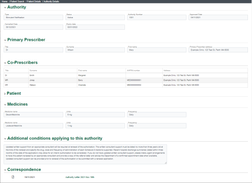 Patient | The name and contact details of the patient for whom the authority was issued. The patient's address details on the authority may not match their address as recorded in ScriptCheckWA. |