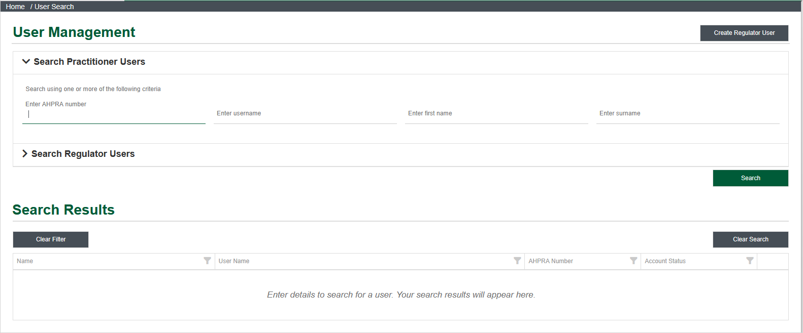 Search for a practitioner by Ahpra Number, username, or name, in order to view or manage their user account.