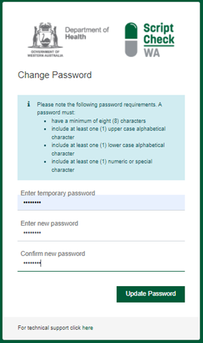 The first time you log into ScriptCheckWA, you will use a temporary password that has been provided to you in an email. You will then be prompted to update your temporary password.